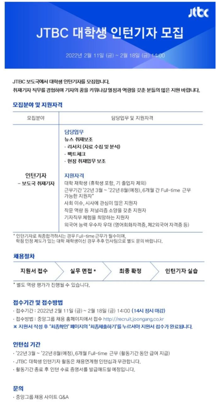 [JTBC] 대학생 인턴기자 채용 (~02/18) 작성자취뽀 I 스탭 02|작성시간22.02.15|조회수19 목록 댓글 0 글자크기 작게가 글자크기 크게가 [JTBC] 대학생 인턴기자 채용 (~02/18) 📌접수기간 : 22.02.11(금)~ 22.02.18(금) 📌고용형태 : 인턴📌접수방법 : 홈페이지 지원📌지원하기 : (클릭) 다음검색 현재 게시글 추가 기능 열기 북마크 공유하기 신고 센터로 신고 댓글 댓글 0 댓글쓰기 답글쓰기 댓글 리스트