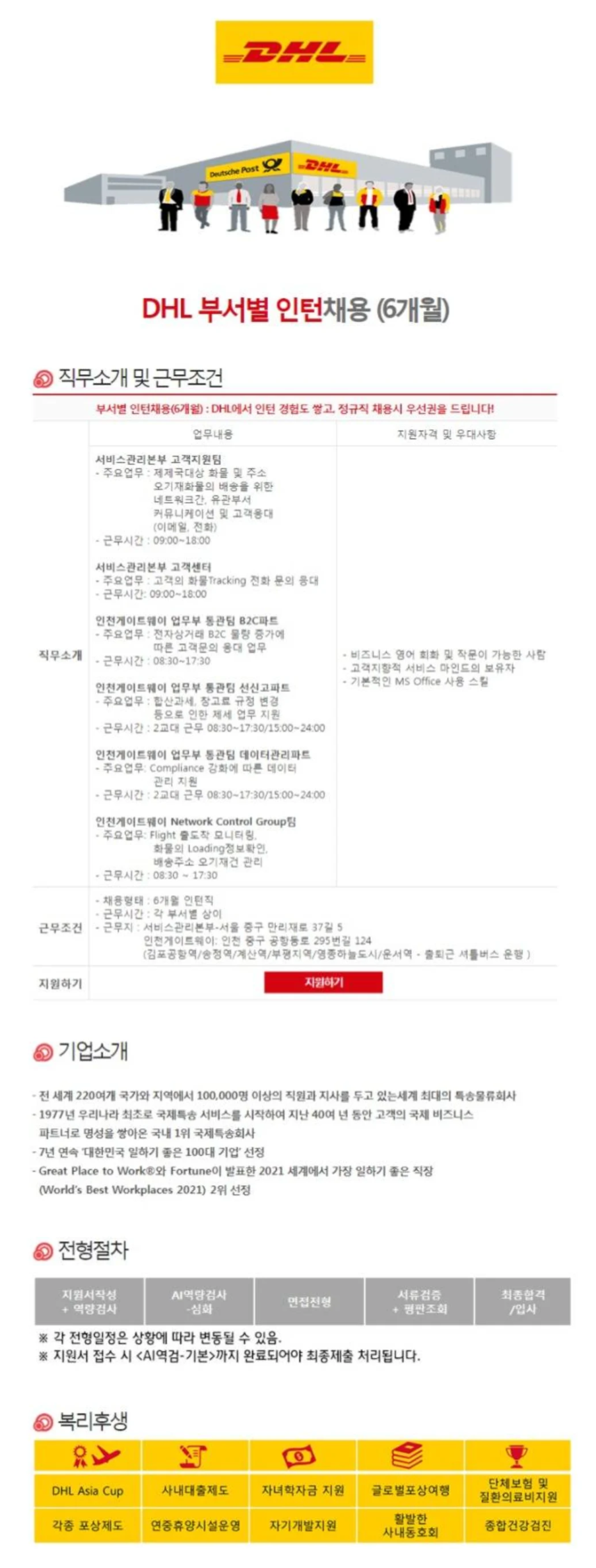 [DHL KOREA] DHL 각 부서별 인턴 채용 (~02/21) 작성자취뽀 I 스탭 02|작성시간22.02.16|조회수16 목록 댓글 0 글자크기 작게가 글자크기 크게가 [DHL KOREA] DHL 각 부서별 인턴 채용 (~02/21) 📌접수기간 : 22.02.11(금)~ 22.02.21(월)📌고용형태 : 인턴📌접수방법 : 홈페이지 지원📌지원하기 : (클릭) 다음검색 현재 게시글 추가 기능 열기 북마크 공유하기 신고 센터로 신고 댓글 댓글 0 댓글쓰기 답글쓰기 댓글 리스트