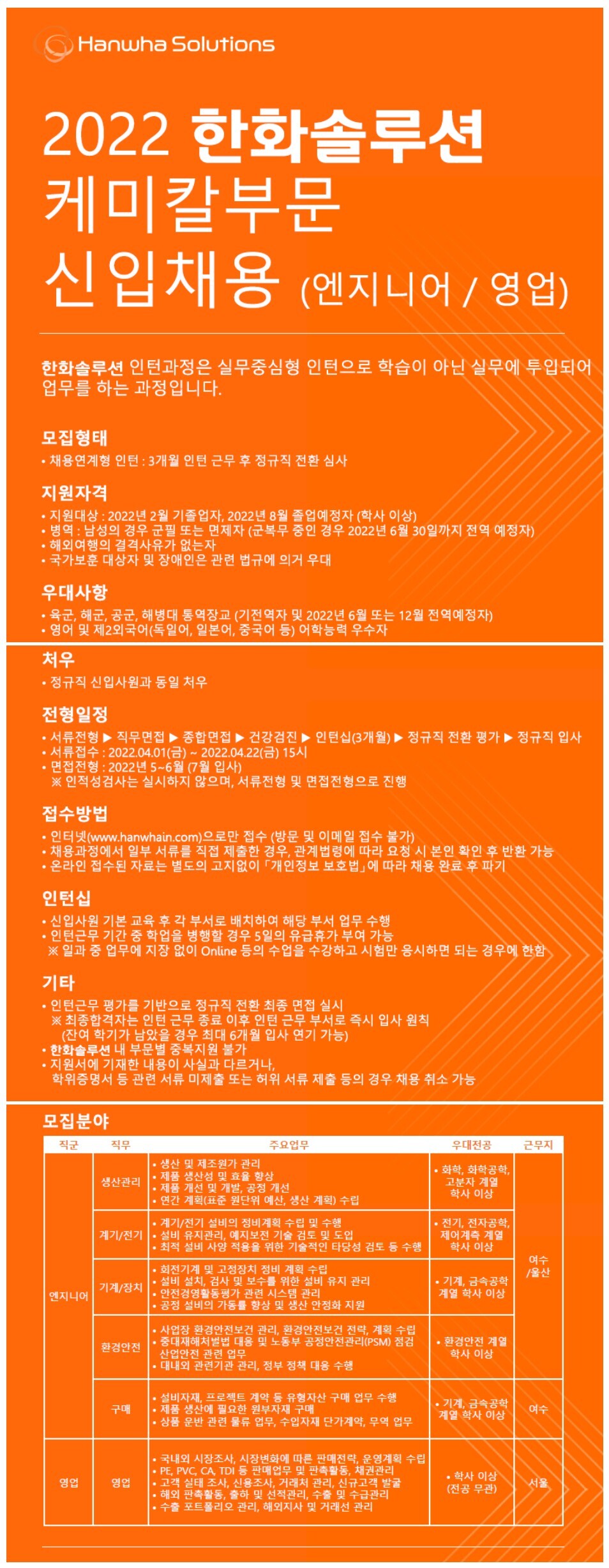 [한화솔루션] 2022년 상반기 각 부문별 신입사원 채용_케미칼 부문(엔지니어/영업) (~04/22)