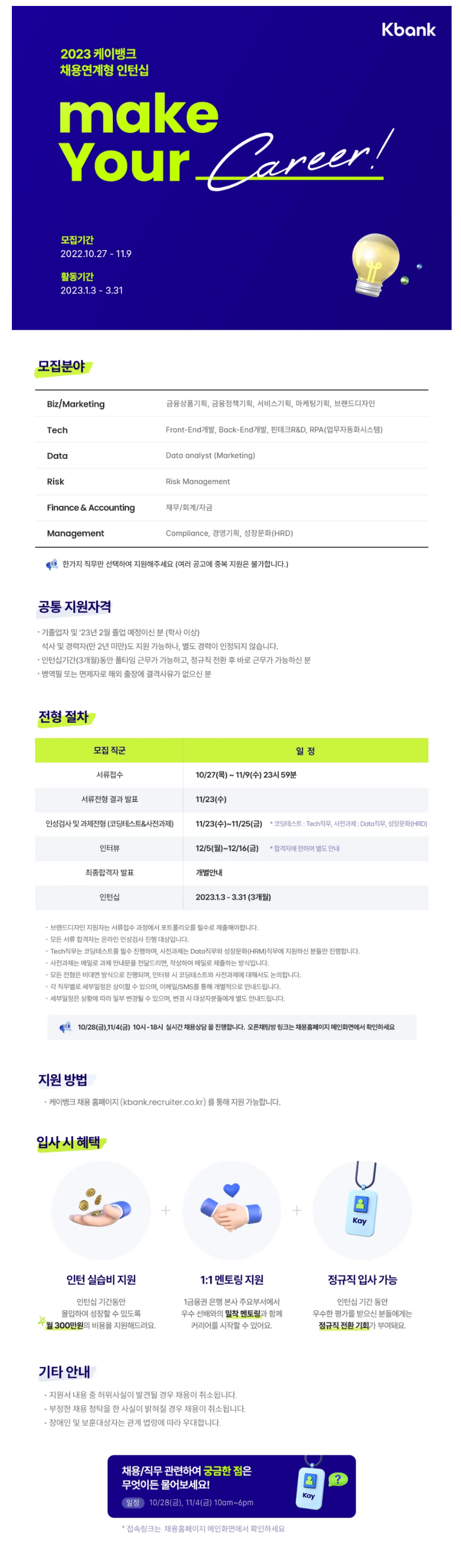 [케이뱅크] 2023 케이뱅크 채용연계형 인턴십 (~11/09) 작성자취뽀 I 스탭 02|작성시간22.10.28|조회수23 목록 댓글 0 글자크기 작게가 글자크기 크게가 [케이뱅크] 2023 케이뱅크 채용연계형 인턴십 (~11/09) 📌접수기간 : 22.10.27(목)~ 22.11.09(수)📌고용형태 : 인턴📌접수방법 : 홈페이지 지원📌지원하기 : (클릭) 다음검색 현재 게시글 추가 기능 열기 북마크 공유하기 신고 센터로 신고 댓글 댓글 0 댓글쓰기 답글쓰기 댓글 리스트