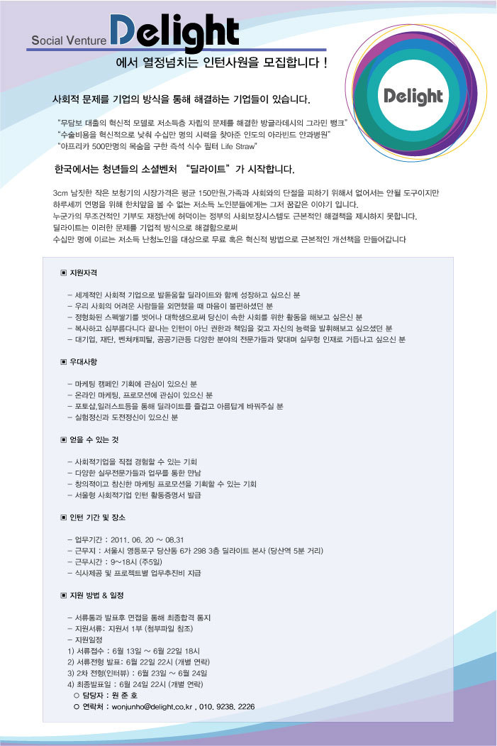 [인턴모집] 사회적기업 딜라이트에서 함께할 열정있는 청년들을 모집합니다. 작성자딜라이트 인사담당자|작성시간11.06.14|조회수354 목록 댓글 1 글자크기 작게가 글자크기 크게가 딜라이트_인턴_지원서.hwp 첨부파일첨부된 파일이 2개 있습니다. jpg 파일 인턴모집-웹용1.jpg 다운로드 hwp 파일 딜라이트_인턴_지원서.hwp 다운로드 다음검색 현재 게시글 추가 기능 열기 북마크 공유하기 신고 센터로 신고 댓글 댓글 1 댓글쓰기 답글쓰기 댓글 리스트 작성자somade | 작성시간 11.06.17 드디어 왔군요 댓글 전체보기