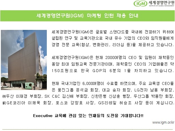 e-mail 접수: talent@igm.or.kr (* 이메일 제목: 지원서_마케팅인턴_성명)
