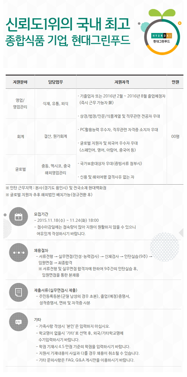 [현대그린푸드 채용] 현대그린푸드 채용 대졸신입 인턴 모집 (11/18~11/24)