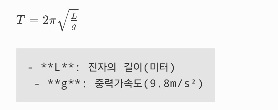 진자의 왕복 주기(T)는 아래 공식에 따라 결정됩니다.