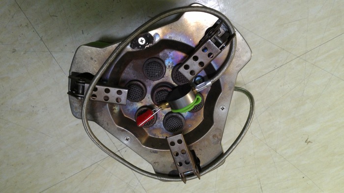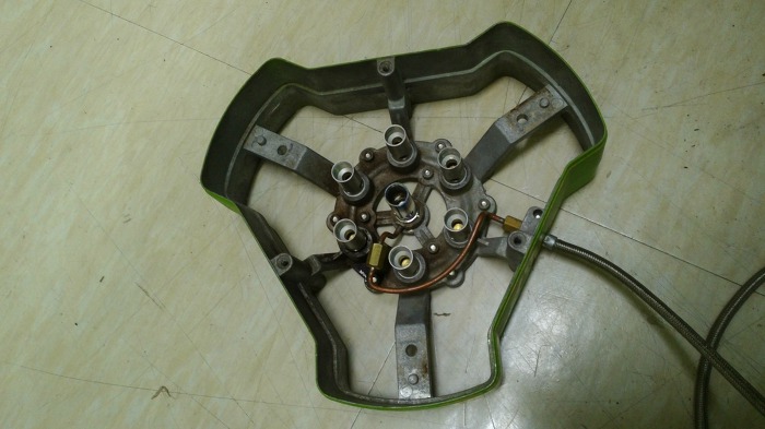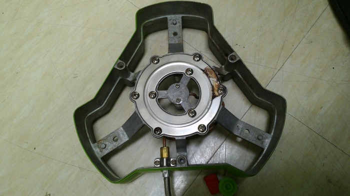 상부뚜껑 걷어내고 노즐 부분 봅니다. 가스 연결이 중앙에 직선으로 들어가는 것과 분지되어 링으로 6개에 공급되는 것으로
