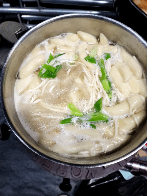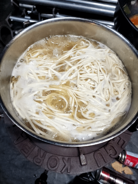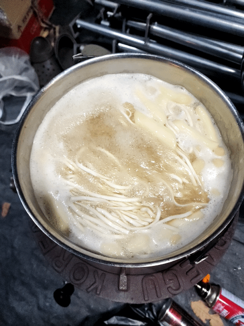 아침식사는 노랭이 개혀버너에 불을 댕겨 어제 못 먹은 칼국수를 끓여 간단히 해결 했습니다!