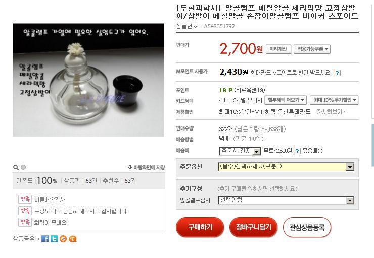 제가 황동버너 사용 초보라 버너를 구해놓고도 알콜을 구하지 못해 시운전을 못하고 있었는데, 오늘 옥션에서 검색을 하다가 메틸알콜을 파는 곳이 있어 바로 주문했습니다.