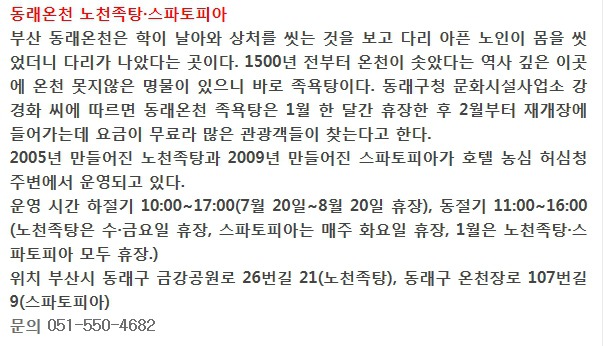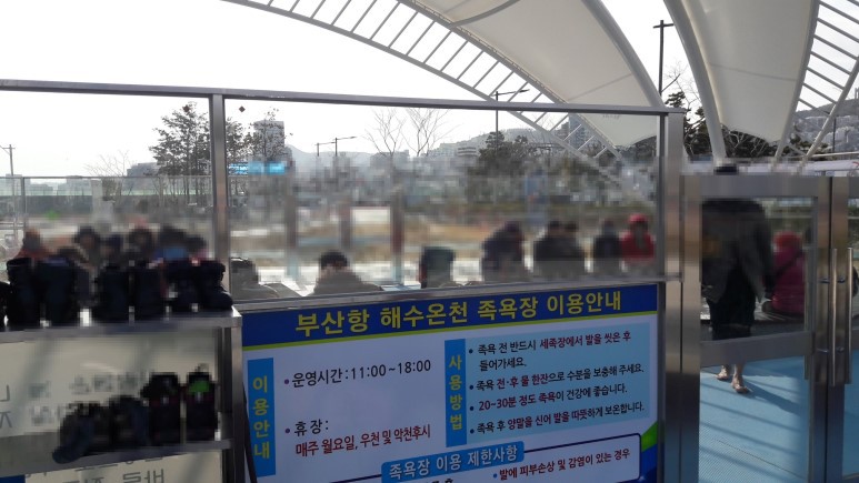 부산항만공사(BPA)는 부산항 국제여객터미널 입구에 사계절 이용이 가능한 해수온천 족욕장 공사를 완료하고 시험운영을 거쳐 다음달 7일부터 본격 운영에 들어간다고 30일 밝혔다. 양질의 해수온천수를 공급할 예정이다. 원형 및 사각 족욕탕 2곳과 세족실, 지압로, 햇빛 차단을 위한 캐노피 등의 편의시설을 갖췄다. 족욕장 동시 수용인원은 50명이며, 시민 누구나 무료로 이용할 수 있다. 앞서 공사는 지난 7월 해수온천을 활용한 야외수영장을 국제여객터미널 야외주차장에 개장하는 등 온천수를 북항재개발사업에 도입, 시민 친수공간을 조성하고 있다. 매주 월요일 우천시및 악천후를 제외하고 매일 11:00부터 오후 6:00까지 운영하며 해수온도는 42~42도로 족욕의 효능은 제2심장이라고 할수 있는 발을 온찜질함으로서 전신혈액순환과 불면증을 해소 건강에 도움이 될수 있다 초량6동 거주 송동현씨는 거의 매일 1달간 족욕함으로 발톱 무좀이살아젔으며 밤에 잠이잘온다고 말씀 한다 |