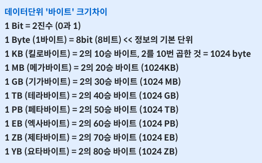 - 8비트는 1바이트, 정보의 기본단위 (8bit = 1byte)
