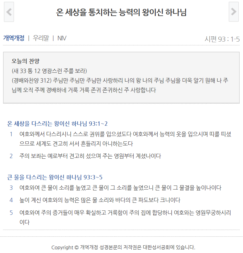 하나님은 온 세상을 통치하는 만왕의 왕이십니다. 시편 전반부(3~89편)는 다윗이 바로 하나님이 세우신 왕임을 인정하고, 그를 통해 역사하시는 하나님을 찬양합니다. 후반부는 다윗 왕조의 멸망으로 인해 진정한 왕은 하나님이시며, 이 세상이 그분 통치 아래 있음을 찬양합니다. 93편은 시편 기자가 바벨론에 포로 된 상황 속에서 진정한 왕이신 하나님의 다스리심을 발견하고, 그분의 왕권을 찬양하는 시로 봅니다. 그가 고난 중에 발견한 것은 하나님 보좌가 세상 중심이며, 하나님이 온 세상의 통치자시라는 사실입니다. 성도가 의지할 것은 세상 권력이 아니라 예로부터 지금까지, 천지 만물을 영원히 다스리는 왕이신 하나님과 그분의 통치입니다.