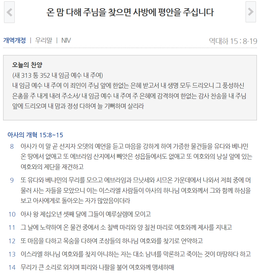 작성자김소영 작성시간 18.11.17 아사의마음이 일평생 온전하였더라 아멘. 아사가 하나님만 전심으로 찾을때 하나님은 사방에 평안을 주셨습니다. 오늘도 주의말씀이 제 속에 있는것들을 다 조명하사 하나님나라와 의에 속하지 않는것 들을 다 제거하게 하소서. 아사의 사방에 임한 평안의 은혜를 저도 소망합니다. 주님 분주하거나 신경쓸일들로 제게 맡겨진 사명을 소홀히 하지 않고 주께 온전히 집중할수 있도록 도와주소서.