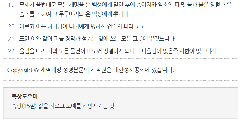 언약의 속죄 원칙이었고, 새 언약의 제사에도 그대로 적용됩니다. 예수님의 피 흘림은 우리 양심의 모든 죄를 깨끗하게 하고, 죽은 행실을 버리게
