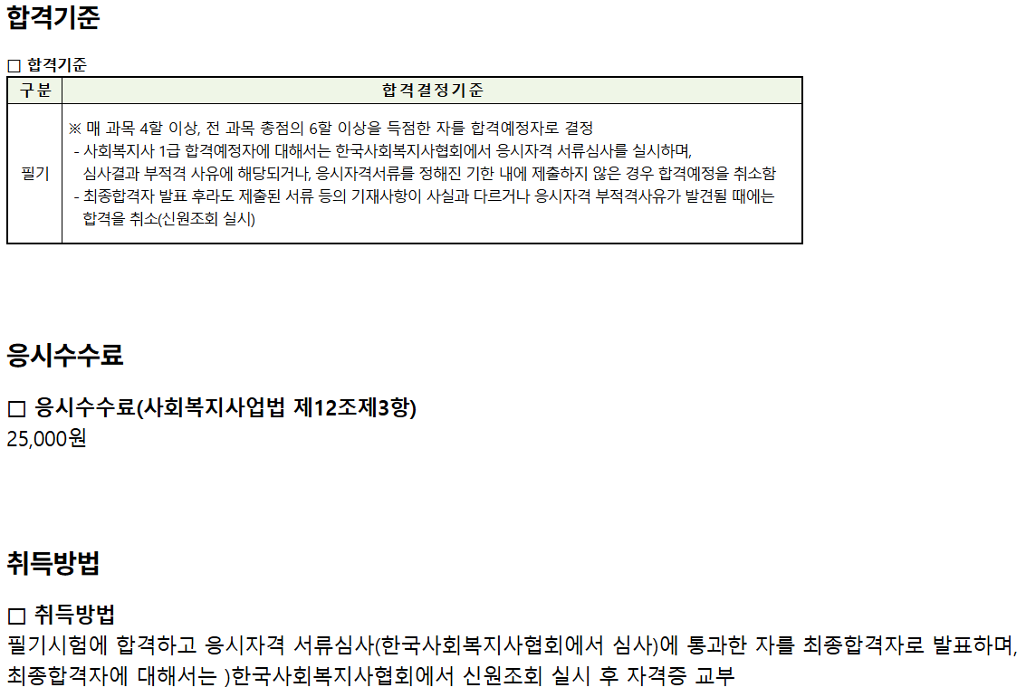 ※ 다만, 대학에서 사회복지학 또는 사회사업학을 전공하지 아니하고 동 석사학위를 취득한 자는 보건복지부령이 정하는 사회복지학 전공교과목과 사회복지관련 교과목 중 사회복지현장실습을 포함한(2004. 07. 31 이후 입학생부터 해당) 필수과목 6과목 이상(대학에서 이수한 교과목을 포함하되, 대학원에서 4과목 이상을 이수하여야 한다), 선택과목 2과목이상을 각각 이수하여야 한다.