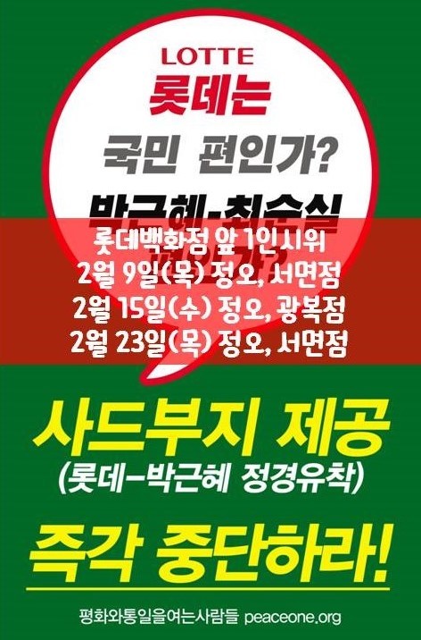 [2017. 2. 9, 15, 23] 사드배치 부지 제공 반대 롯데백화점 앞 1인시위 작성자부산|작성시간17.02.08|조회수247 목록 댓글 1 글자크기 작게가 글자크기 크게가 다음검색 현재 게시글 추가 기능 열기 북마크 공유하기 신고 센터로 신고 댓글 댓글 1 댓글쓰기 답글쓰기 댓글 리스트 작성자신차 | 작성시간 17.05.25 정경유착은 악습 관행이라고... 댓글 전체보기
