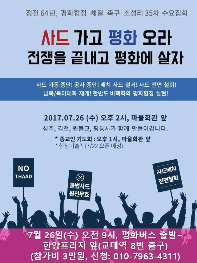 부산(경남,울산)평통사 소식 64호(2017. 7. 10) "7월 26일, 소성리에서 만나요~" 작성자부산|작성시간17.07.10|조회수160 목록 댓글 0 글자크기 작게가 글자크기 크게가 부산(경남, 울산)평통사 소식 64호 (2017. 6. 17~7. 10)사드철회! 한반도 비핵화와 평화협정 실현! 2017 부산 평화홀씨마당과 평화홀씨전 잘 마쳤습니다. (평화홀씨전은 22일부터 소성리에서 다시 열립니다.)내용 보기 : http://cafe.daum.net/bsspark/kBUo/156 사드철회! 소성리 현장 지킴이 활동과 청와대 앞 1인시위는 계속됩니다. 전국의 회원들이 돌아가며 소성리 현장을 지킵니다. 부산과 마창진 회원들도 힘을 보태고 있어요. 7월 부산 담당은 7월 14일부터 21일까지입니다. 문재인 대통령이 사드 철회를 위해 흔들림없이 나서라는 요구를 담아 전개하는 청와대 앞 하루종일 1인시위도 전국의 회원들이 순회하며 이어가고 있습니다. 부산 담당은 7월 21일입니다. 매 주 월요일 저녁 7시 30분에 합창홀씨모임이, 매 월 공부모임이 진행되고 있습니다.(7월은 12일(수) 오전 10시, 평화협정 공부합니다.)7월 26일, 소성리에서 만나요~ 다음검색 현재 게시글 추가 기능 열기 북마크 공유하기 신고 센터로 신고 댓글 댓글 0 댓글쓰기 답글쓰기 댓글 리스트