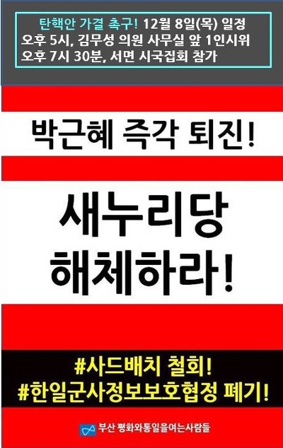 [2016. 12. 8/ 부산] 탄핵안 가결 촉구! 김무성 의원 사무실 앞 1인시위와 시국집회 참가 공지 작성자부산|작성시간16.12.08|조회수19 목록 댓글 0 글자크기 작게가 글자크기 크게가 1인시위 후 집회에 참가합니다. 다음검색 현재 게시글 추가 기능 열기 북마크 공유하기 신고 센터로 신고 댓글 댓글 0 댓글쓰기 답글쓰기 댓글 리스트