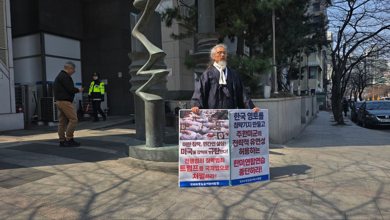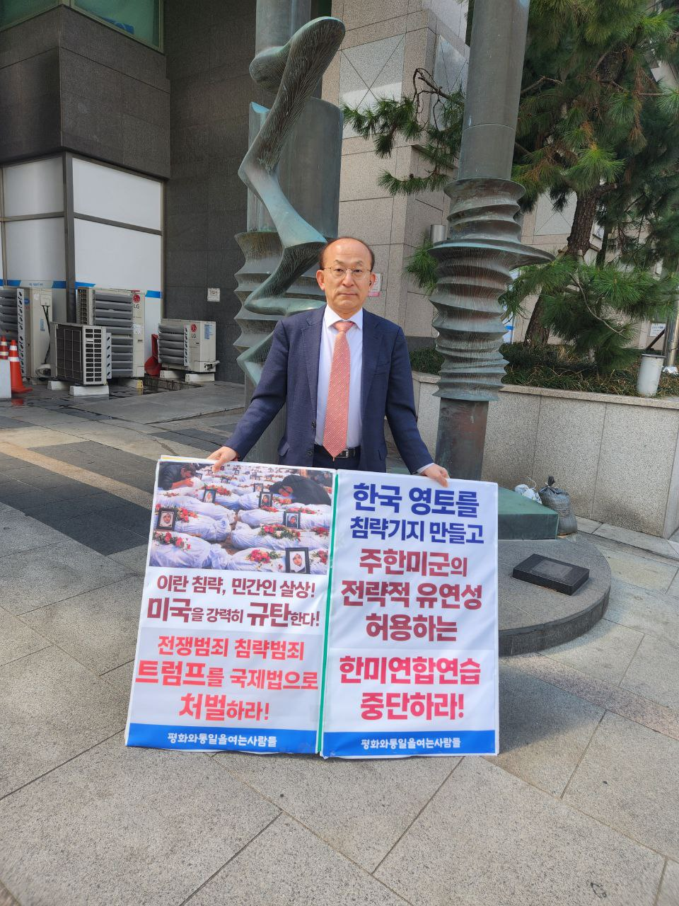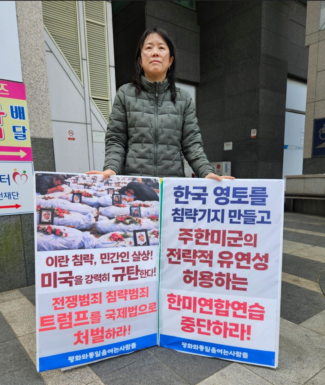 이번 주부터 시작한 한미연합연습 프리덤 실드 중단을 촉구하는 1인시위를, 이란전쟁을 규탄하는 내용과 함께 진행했습니다.