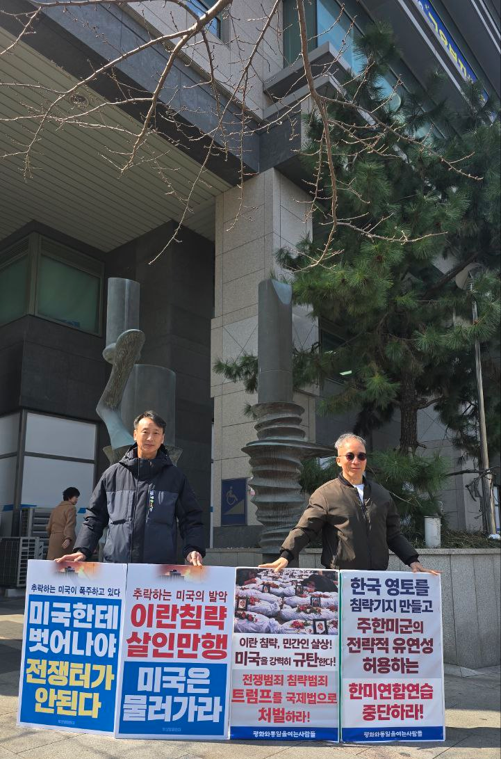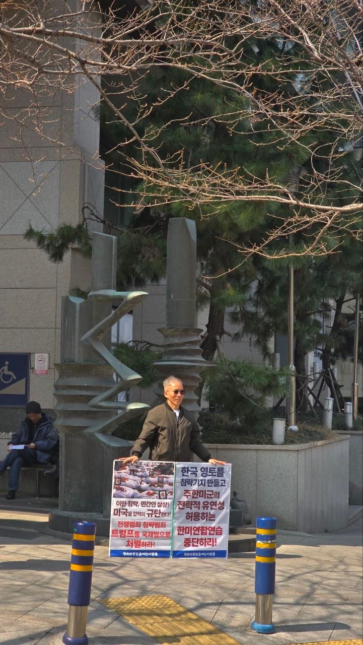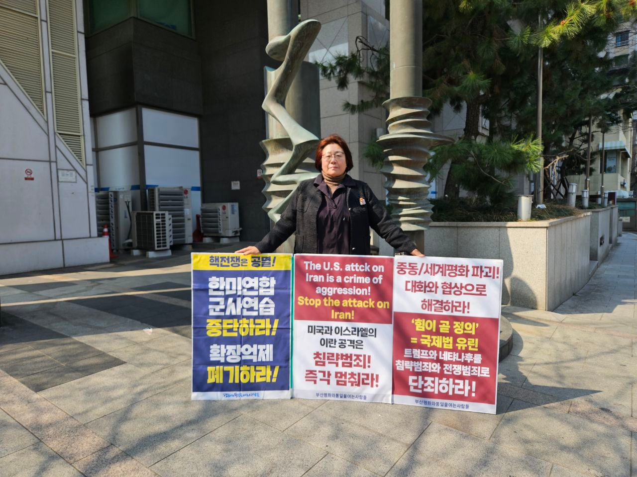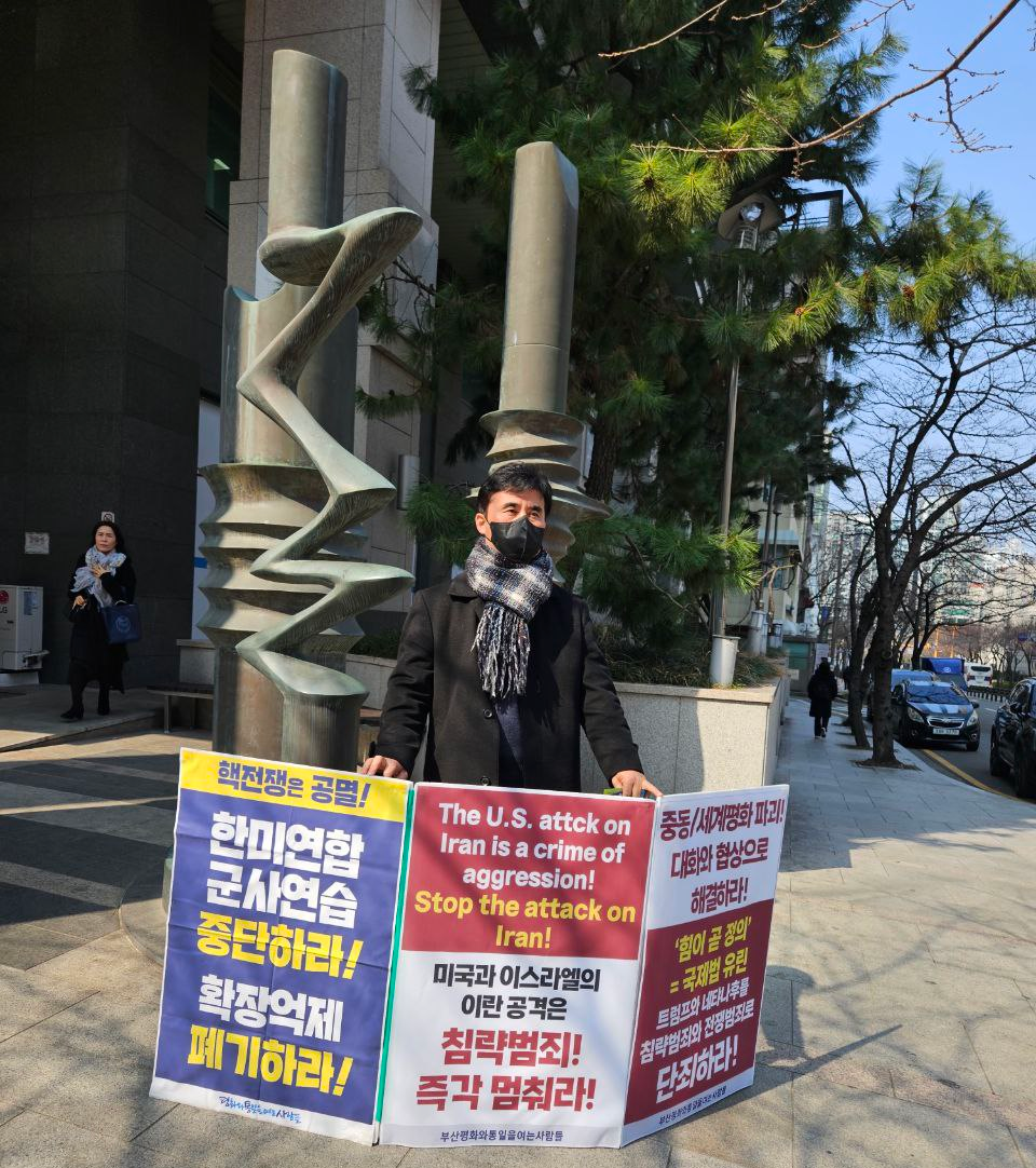 이번 주부터 시작한 한미연합연습 프리덤 실드 중단을 촉구하는 1인시위를, 이란전쟁을 규탄하는 내용과 함께 진행했습니다.