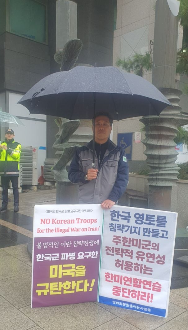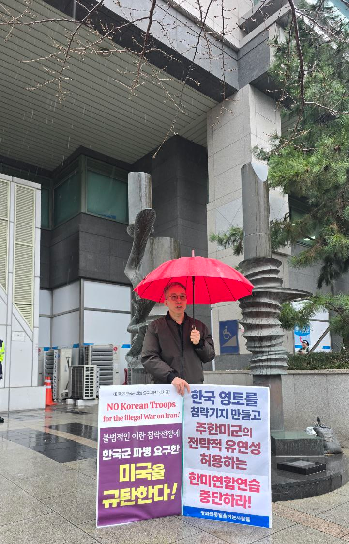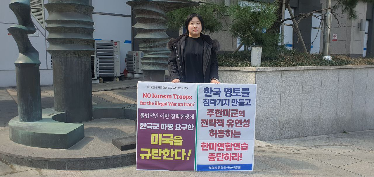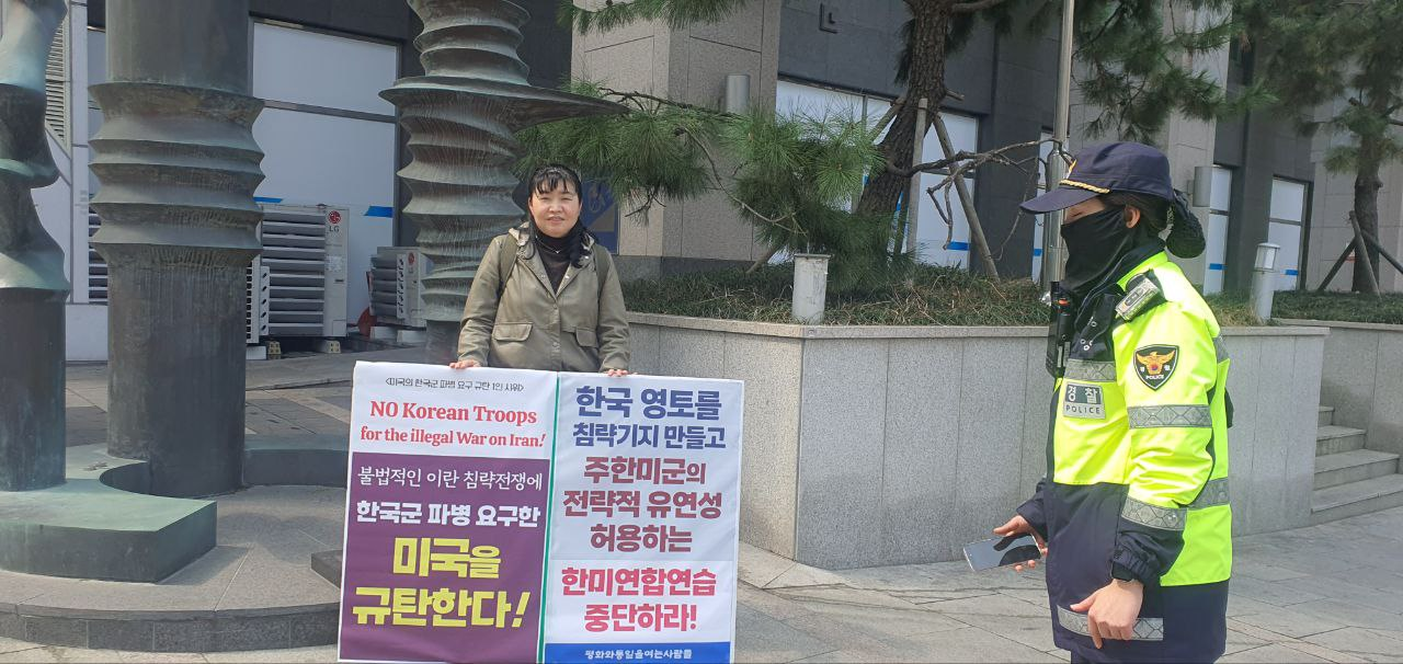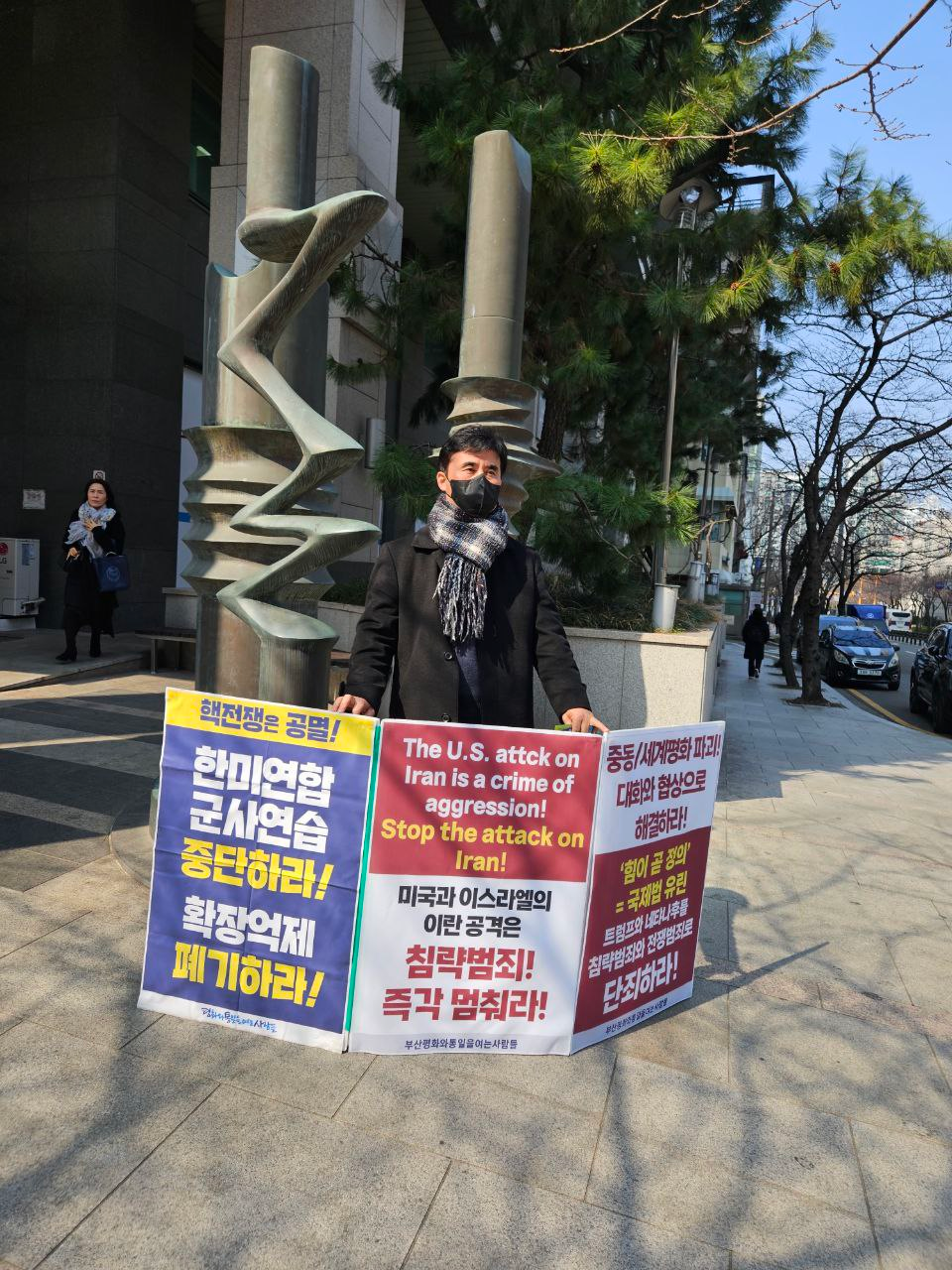 9일부터19일까지, 한미연합연습 기간 동안 월~금까지 부산 미영사관 앞에서 미국의 이란 침략과 한국에 대한 파병 요구를 규탄하고, 이란 침략의 연속선 상에서 진행하는 한미연햡연습 중단을 촉구하는 연속 1인시위를 진행했습니다.