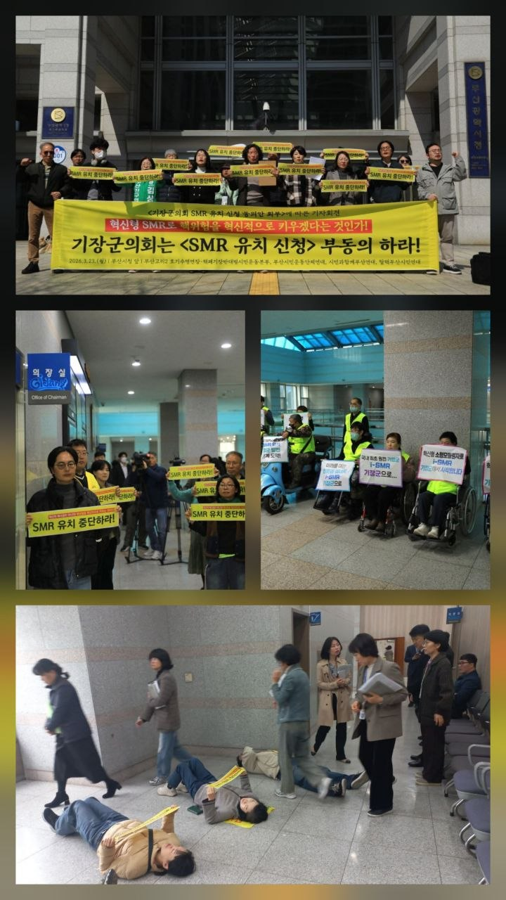 어제(3월 24일) 기장군의회 상임위는 소형모듈원자로(SMR) 유치를 의결했습니다. 이에 부산평통사는 탈핵부산시민연대 차원에서 23일부터 대응에 나서고 있습니다. 오늘은 기장의회 본회의가 열려 군청 앞 기자회견 등 대응을 진행합니다.