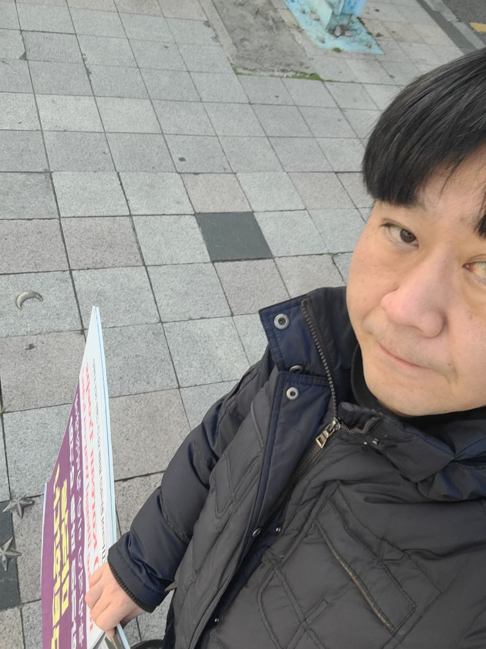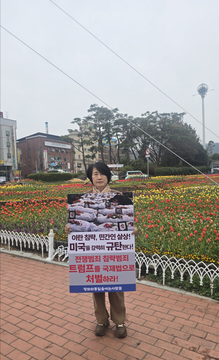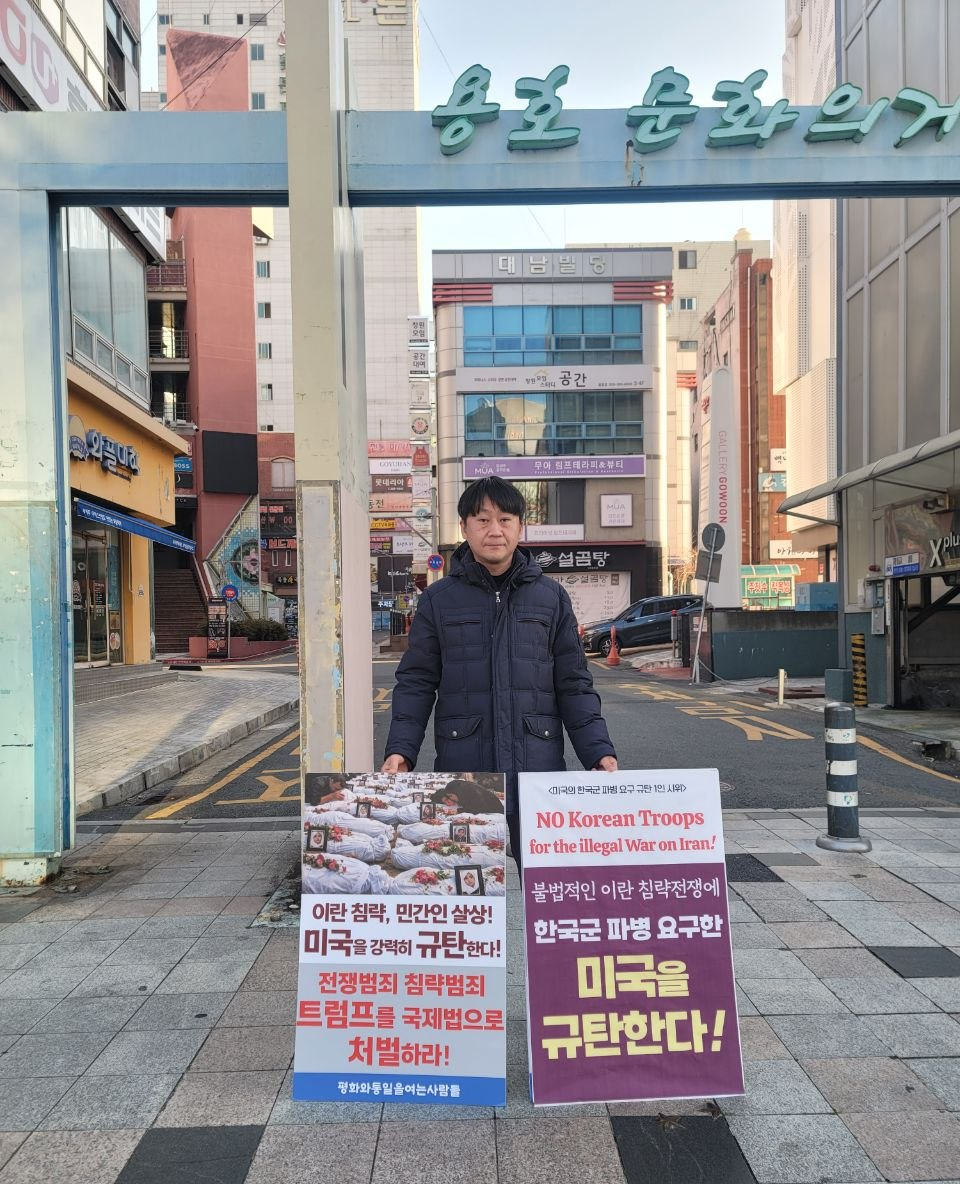 수요일은 아니지만, 이상엽 운영위원이 계속되고 있는 미국의 이란 전쟁을 규탄하며 정우상가 앞에서 1인시위에 나섰습니다.
