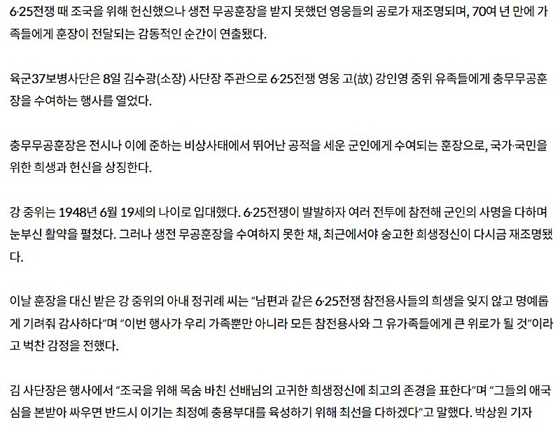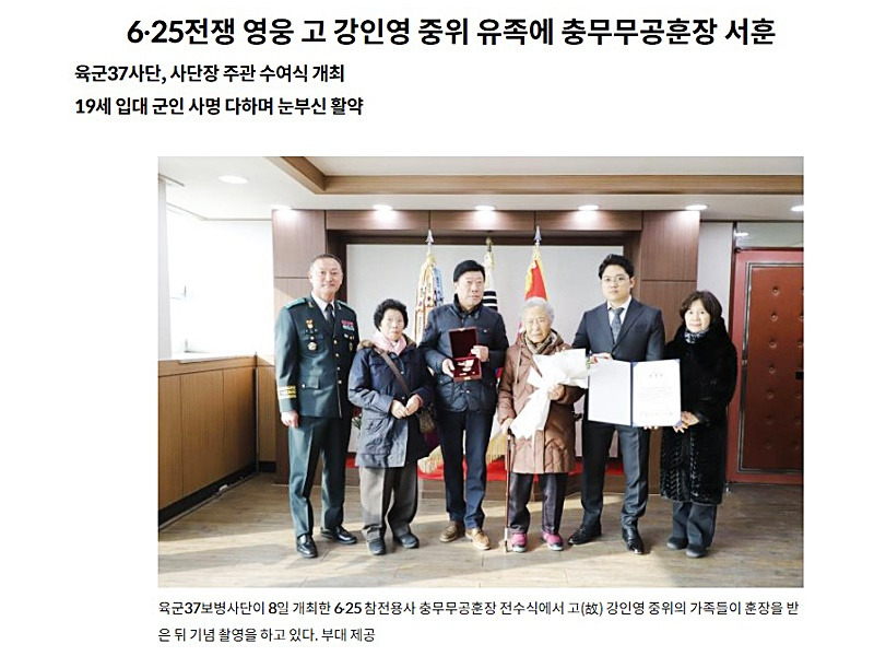 2025년 1월 9일자 국방일보 6면에 6.25전쟁 영웅 "고" 중위 강인영 에게
