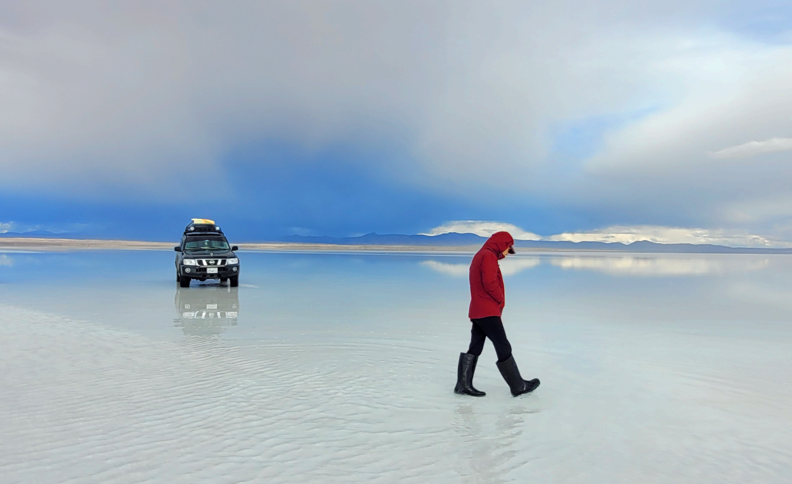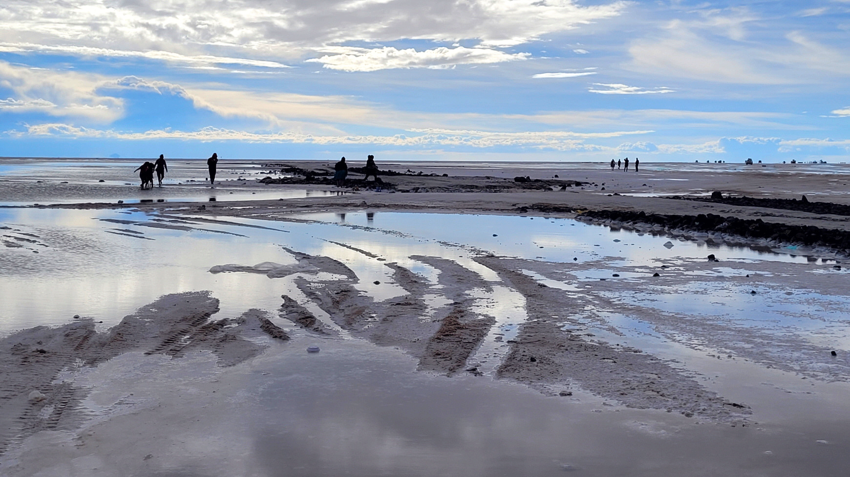 차로 달려 20~30여분, 소금사막 초입에 내려 장화 골라신고 들어갑니다.