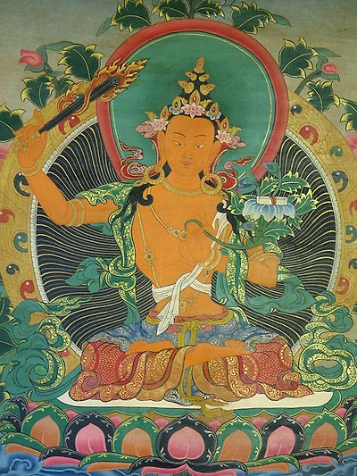 산스크리트 Mañjuśrῑ를 음사한 문수사리(文殊師利)의 별칭입니다. Mañjuśrῑ라는 산스크리트는 묘길상(妙吉祥)이라고도 번역되며 묘음보살(妙音菩薩)이라고도 합니다. 또 바기슈바라(Vāgῑśvara:언어의 주인)라고도 합니다.