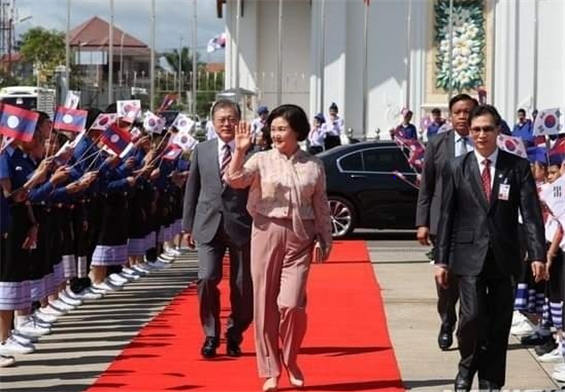 문재인 대통령 일행이 라오스를 방문했을 때 의전(儀典)은 받고 있는 장면.