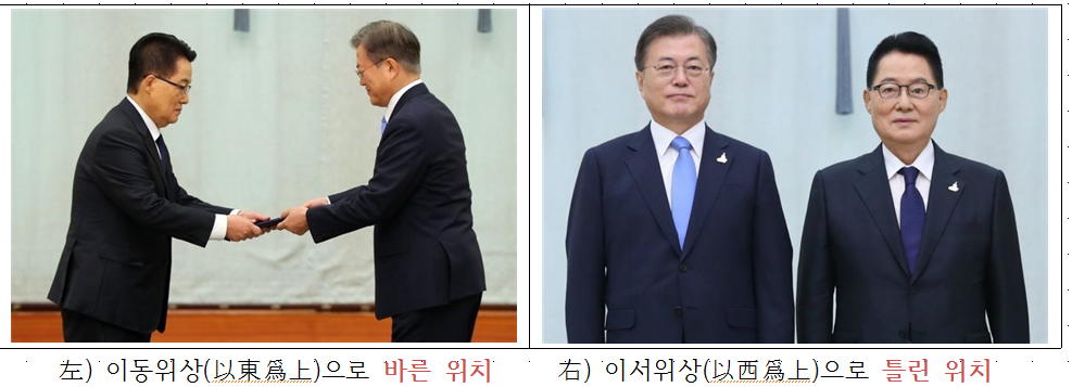 청와대 행사시의 의전(儀典)에 ‘상급자와 하급자의 위치’는 예절의 방위(위계질서)에 의하여