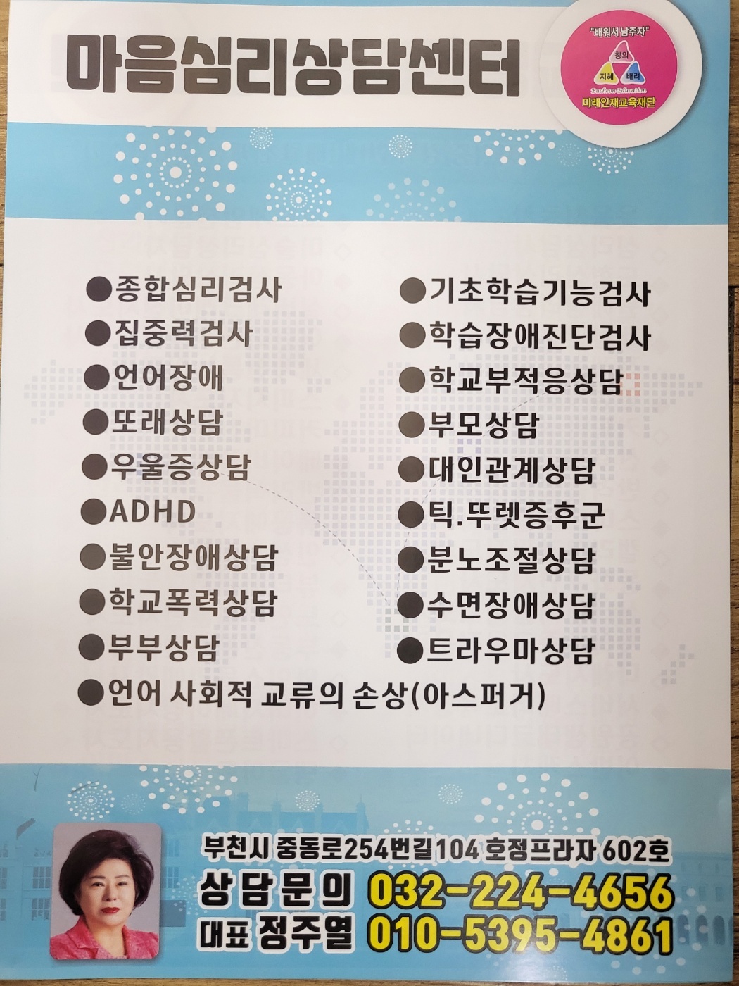 아울러 "마음심리상담센터" 를 개원하였습니다.
