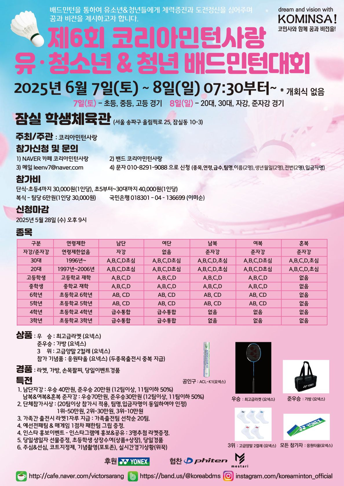 네이버카페(코리아민턴사랑), 메일(leenv7@naver.com),