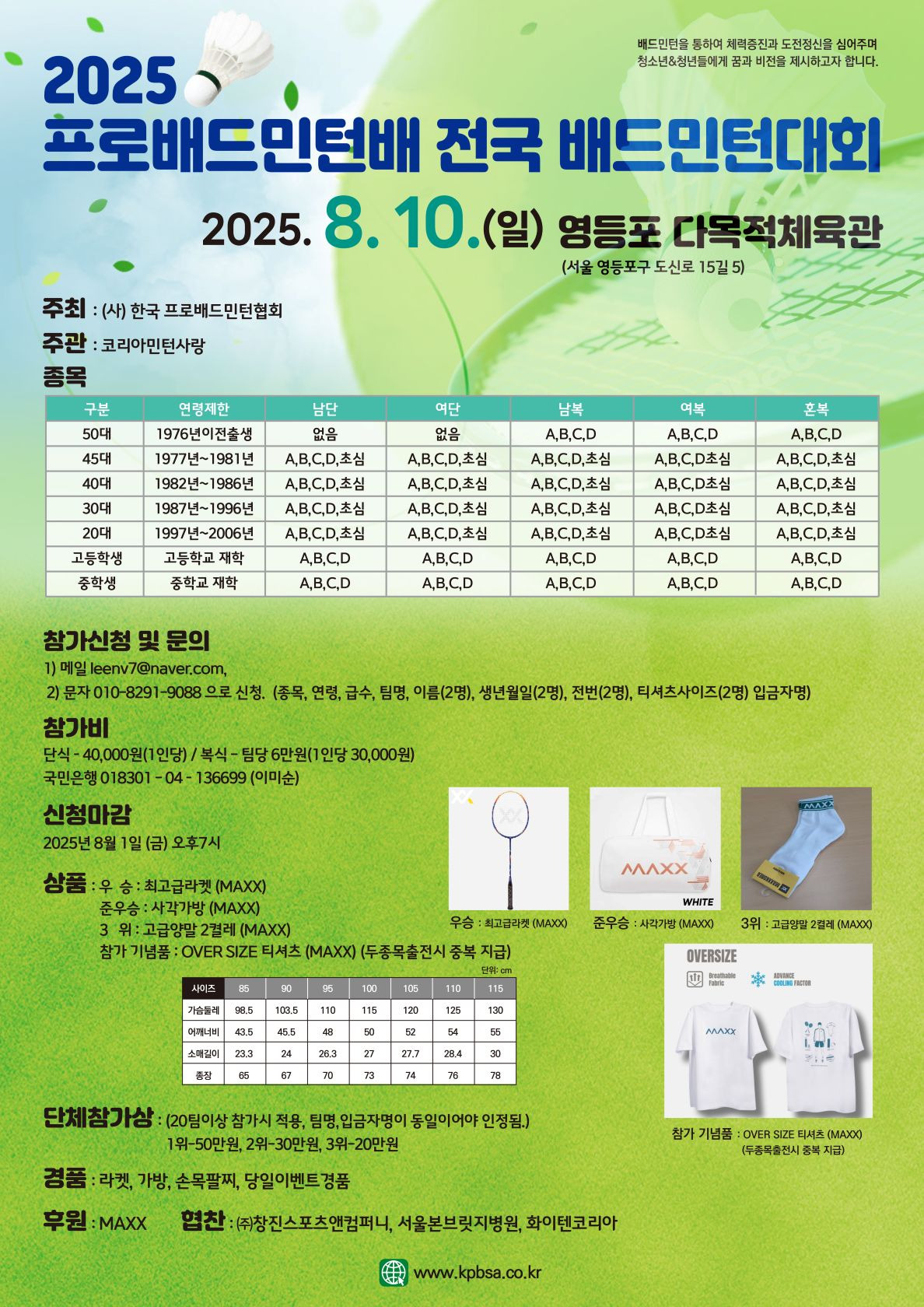 2205 프로배드민턴배 전국 배드민턴대회 작성자이진의(코리아민턴)|작성시간25.07.06|조회수32 목록 댓글 0 글자크기 작게가 글자크기 크게가 2025 한국 프로배드민턴 협회단식 종목이 함께 하는 배드민턴대회!!*** 코민사 주관대회 입니다.(요강)2025 프로배드민턴배 전국 배드민턴대회 V2.pdf165.89KB 첨부파일첨부된 파일이 2개 있습니다. pdf 파일 (요강)2025 프로배드민턴배 전국 배드민턴대회 V2.pdf 다운로드 jpg 파일 수정(홍보) 2025 프로배드민턴대회.jpg 다운로드 다음검색 현재 게시글 추가 기능 열기 북마크 공유하기 신고 센터로 신고 댓글 댓글 0 댓글쓰기 답글쓰기 댓글 리스트