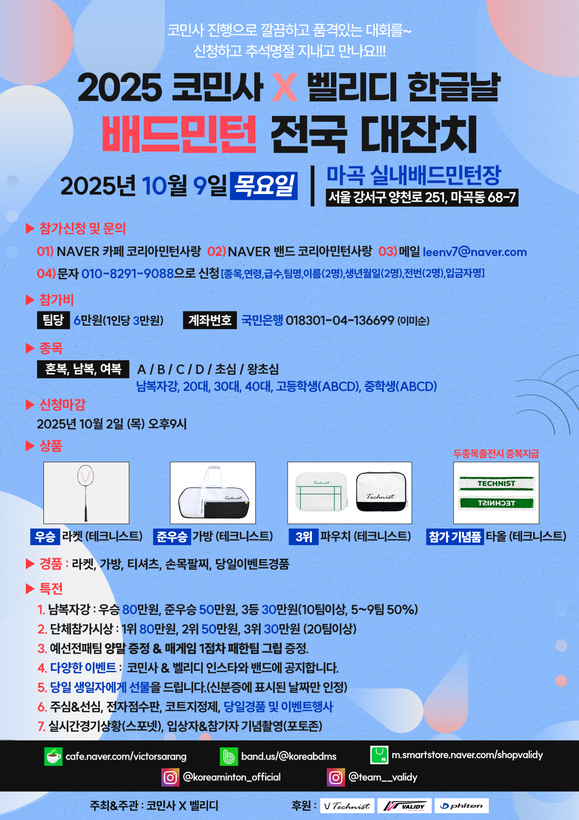2025 코민사 X 벨리디 한글날 배드민턴 전국 대잔치 작성자이진의(코리아민턴)|작성시간25.08.25|조회수10 목록 댓글 0 글자크기 작게가 글자크기 크게가 2025 코민사 X 벨리디 한글날 배드민턴 전국 대잔치 - 코민사 진행으로 끔하고 품격있는 대회를~~~- 신청하고 추석명절 지내고 만나요!!!수정(요강) 2025 코민사X벨리디 한글날 배드민턴 전국 대잔치.pdf180.19KB 첨부파일첨부된 파일이 2개 있습니다. png 파일 (홍보) 2025 벨리디대회.png 다운로드 pdf 파일 수정(요강) 2025 코민사X벨리디 한글날 배드민턴 전국 대잔치.pdf 다운로드 다음검색 현재 게시글 추가 기능 열기 북마크 공유하기 신고 센터로 신고 댓글 댓글 0 댓글쓰기 답글쓰기 댓글 리스트