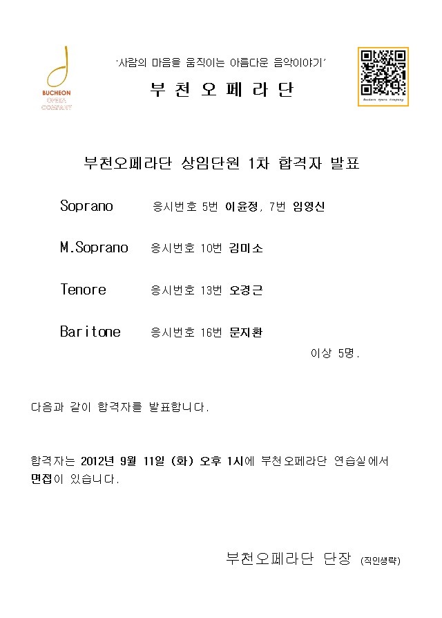 부천오페라단 상임단원 1차 합격자 발표 작성자사무국장|작성시간12.09.05|조회수66 목록 댓글 0 글자크기 작게가 글자크기 크게가 다음검색 현재 게시글 추가 기능 열기 북마크 공유하기 신고 센터로 신고 댓글 댓글 0 댓글쓰기 답글쓰기 댓글 리스트