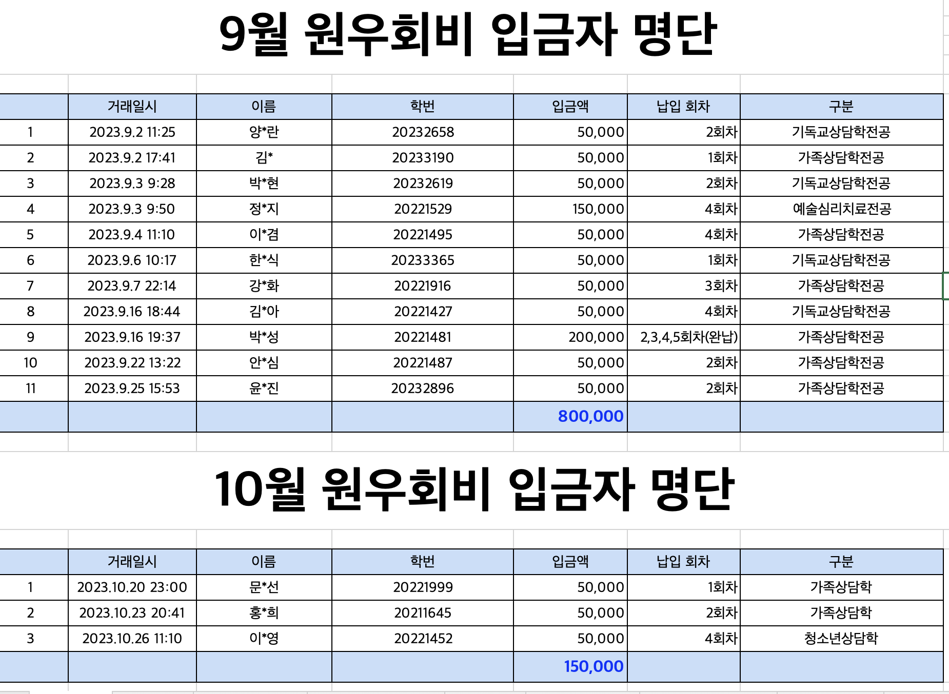[공지]9월 & 10월 원우회비 입금자 명단 안내 작성자기독교상담22안세정|작성시간23.11.03|조회수201 목록 댓글 1 글자크기 작게가 글자크기 크게가 안녕하세요.9월과 10월 원우회비를 납부해 주신 선생님들께 감사 인사 전합니다. ^^ 하단에 입금자 명단을 안내해 드렸으니 참고해 주시기 바랍니다. 쌀쌀한 날씨에 건강 유의하세요~ 다음검색 현재 게시글 추가 기능 열기 북마크 공유하기 신고 센터로 신고 댓글 댓글 1 댓글쓰기 답글쓰기 댓글 리스트 해당 댓글은 작성자와 운영진만 볼 수 있습니다. 댓글 전체보기