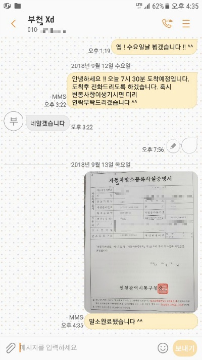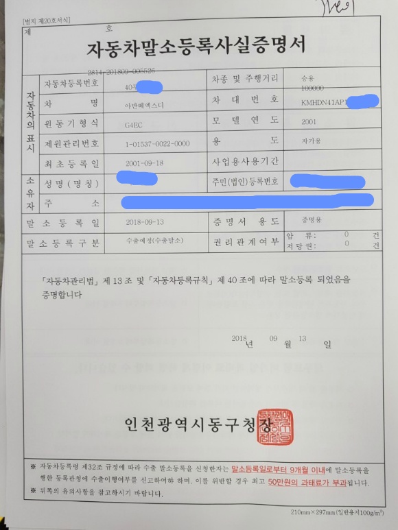말소는 2018년 9월 13일 차량인수다음날 말소완료됐습니다.