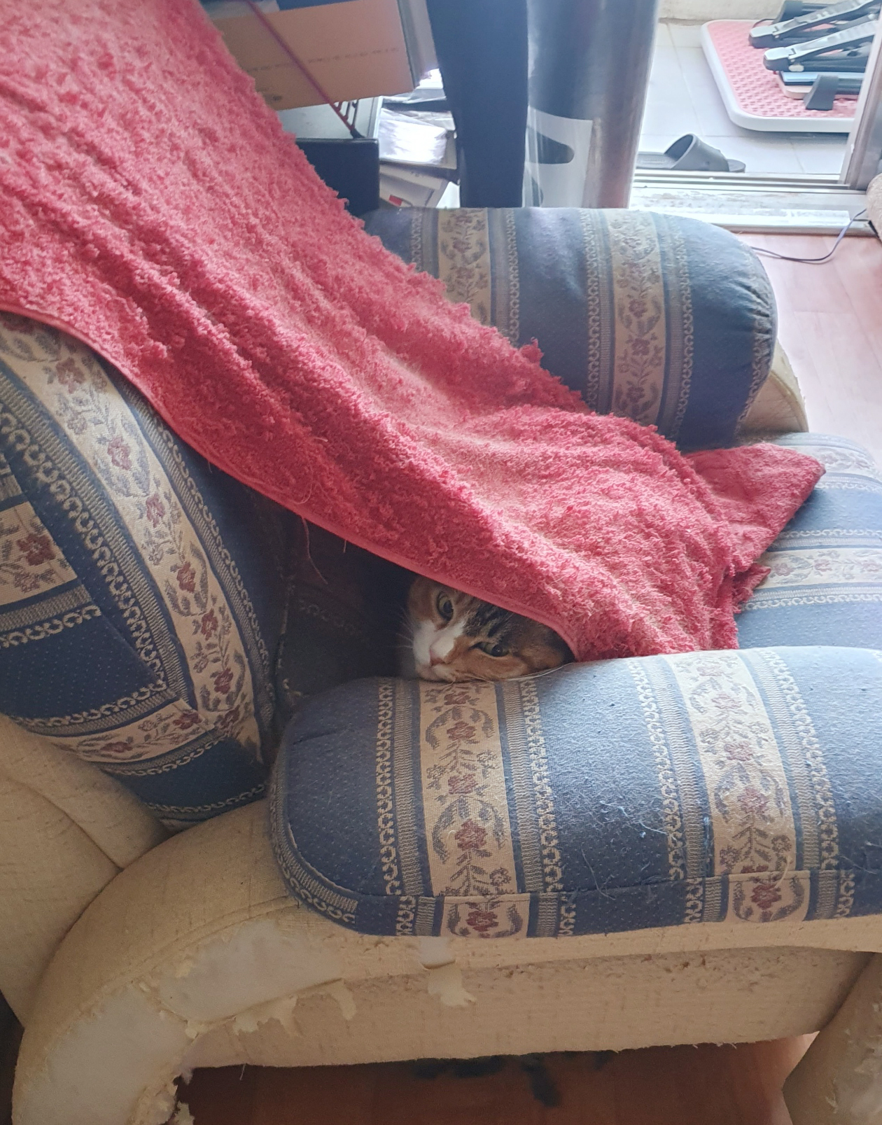 소파 위 빨간 수건 속과 아빠노미 겨울 잠바 위에서