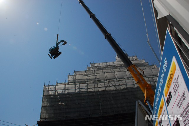 ◆ 제천 화재참사 건물 철거공사 투입되는 굴착기 ▷ 본, 'Netizen Photo News' 는 가입 필요없이 손님께서도 연결에 넣어두고 날마다 보실 수 있습니다. (저작권 있음) '한국 네티즌본부' ○··· 【제천=뉴시스】이병찬 기자 = 7일 충북 제천 스포츠센터 화재참사 건물 철거 현장에서 소형 굴착기가 대형 크레인에 들려 지상 38m 건물 9층으로 올라가고 있다. bclee@newsis.com |
