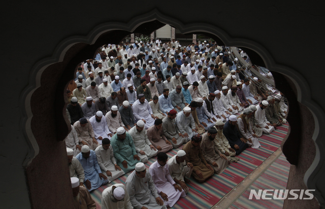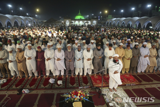 ○··· 【페샤와르(파키스탄)=AP/뉴시스】라마단 시작일인 6일(현지시간) 파키스탄 페샤와르의 한 모스크에서 파키스탄 이슬람교도들이 저녁 기도회인 '타라위'에 참석해 기도하고 있다. 전 세계의 이슬람교도들은 라마단 기간 중 일출에서 일몰까지 음식, 음료, 기타 유흥 등을 금하는 이른바 금욕 생활을 한다.