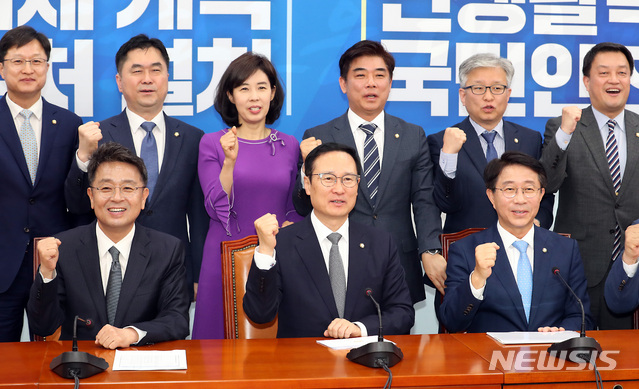◆ 파이팅 하는 홍영표와 원내대표단 ▷ 본, 'Netizen Photo News' 는 가입 필요없이 손님께서도 연결에 넣어두고 날마다 보실 수 있습니다. (저작권 있음) '한국 네티즌본부' ○··· 7일 오전 서울 여의도 국회에서 민주당 홍영표 원내대표가 마지막 원내대책회의를 주재한뒤 원내대표단들과 파이팅을 하고 있다. jc4321@newsis.com |