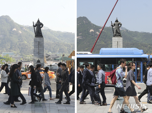 ◆ 낮에는 덥고...아침은 쌀쌀...일교차 큰 날씨 ▷ 본, 'Netizen Photo News' 는 가입 필요없이 손님께서도 연결에 넣어두고 날마다 보실 수 있습니다. (저작권 있음) '한국 네티즌본부' ○···【서울=뉴시스】최진석 기자 = 전국이 맑은 가운데 일교차가 클 것으로 예보된 7일 오전 서울 광화문 네거리에서 시민이 가벼운 외투를 입고 출근길 발걸음을 재촉는 모습(왼쪽 사진)과 오후 같은 장소에 외국인이 반팔에 반바지를 입고 발걸음을 재촉하는 모습이 대조를 이루고 있다.