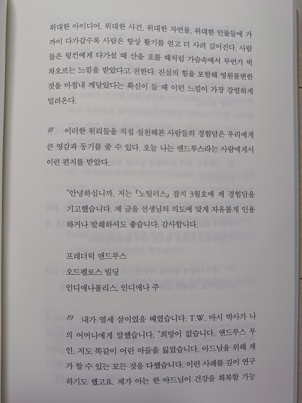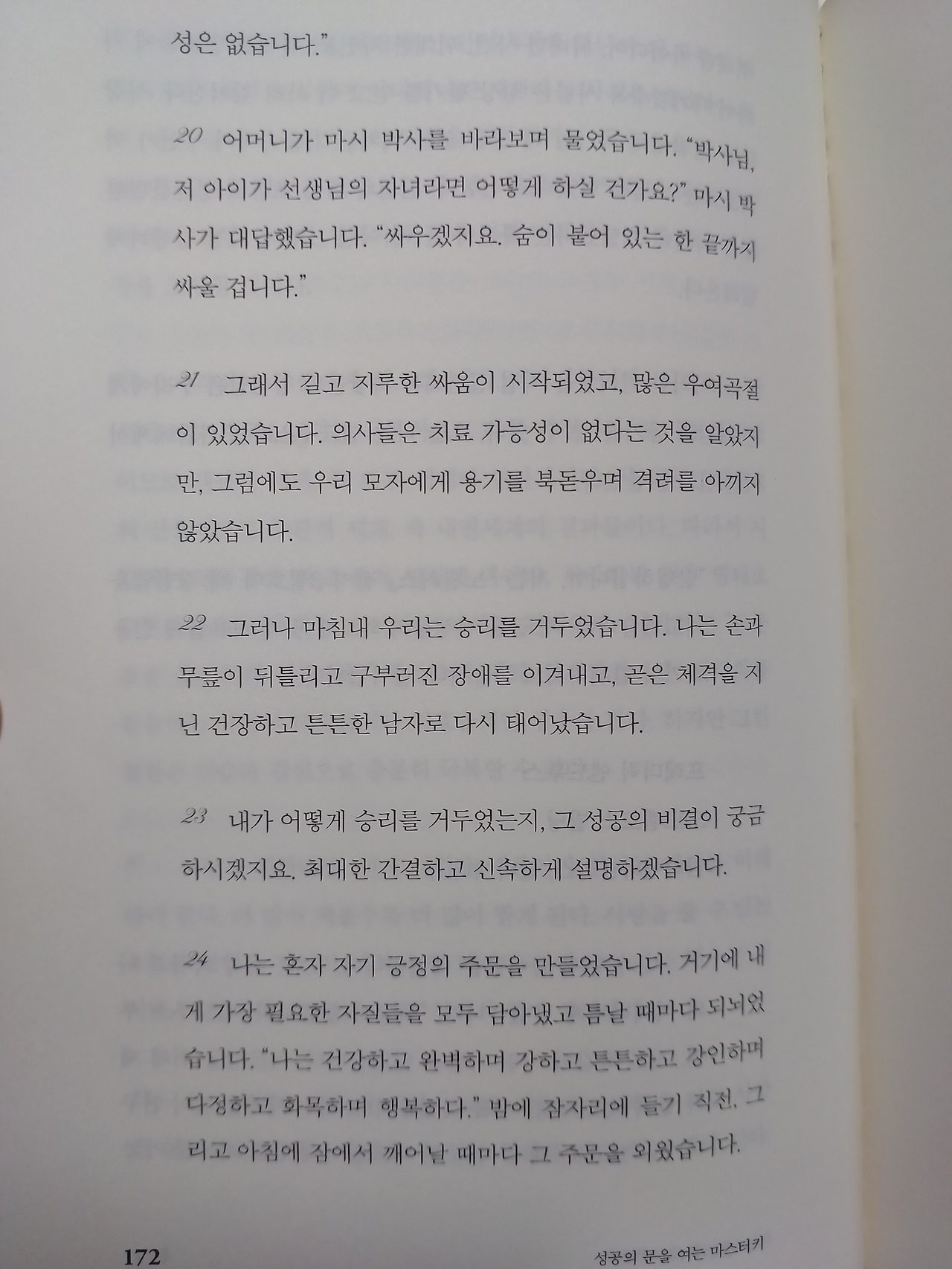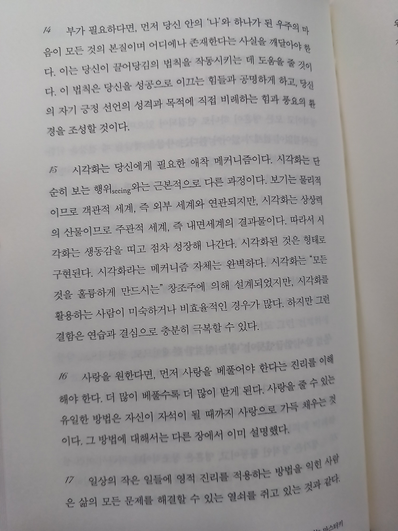 | 당신이 이미 가지고 있는 심적 자원을 깨달으라 ㅣ성공의 문을 여는 마스터키 ㅣ 찰스 해낼 ㅣ 샨티 주소 : https://youtu.be/p-Uf7Vfr9mg?si=0xg-G0WE7gjyVsBF 🍉 찰스 F. 해낼 진실이 우주의 마음을 떠받치는 중대한 원칙이고 어디에나 존재한다는 사실을 깨달으면, 우리는 관련된 애착 메커니즘을 정확 하게 찾아낼 수 있다. 예컨대 건강이 필요하다면, 당신 안의 '나'가 영적이고 모든 영혼이 하나로 연결되어 있으며, 부분이 있는 곳에 는 어김없이 전체가 있어야 한다는 사실을 깨달을 때 건강을 위한 조건이 형성된다. 몸속의 모든 세포가 당신의 눈에 진실을 선명하 게 비춰줄 것이기 때문이다. 당신이 질병을 보면 세포들이 질병을 드러내고, 완벽한 건강을 보면 세포들이 완벽한 건강을 보여줄 것이다. "나는 건강하고 완벽하며 강하고 튼튼하고 강인하며 다정하고 화목하며 행복하다"라는 자기 긍정의 주문은 조화로운 상 태를 만들어낸다. 그런 자기 긍정이 진실과 정확히 부합하기 때문이다. 진실이 드러나는 순간 모든 형태의 오류와 불화는 필연적으 로 자취를 감춘다. 앞서 언급했듯이 '나'는 영적인 존재이므로 필연적으로 항상 완벽할 수밖에 없다. 그러므로 “나는 건강하고 완벽하며 강하고 튼 튼하고 강인하며 다정하고 화목하며 행복하다"라는 자기 긍정의 선언은 과학적 기준에서 한 치의 어긋남도 없다. 생각은 영적인 활동이고, 영혼은 창조적이다. 따라서 이런 생각을 마음에 품은 결과는 생각과 조화를 이루는 환경을 조성하기 마련이다. 부가 필요하다면, 먼저 당신 안의 '나'와 하나가 된 우주의 마 음이 모든 것의 본질이며 어디에나 존재한다는 사실을 깨달아야 한다. 이는 당신이 끌어당김의 법칙을 작동시키는 데 도움을 줄 것이다. 이 법칙은 당신을 성공으로 이끄는 힘들과 공명하게 하고, 당신의 자기 긍정 선언의 성격과 목적에 직접 비례하는 힘과 풍요의 환경을 조성할 것이다. 시각화는 당신에게 필요한 애착 메커니즘이다. 시각화는 단 순히 보는 행위seeing와는 근본적으로 다른 과정이다. 보기는 물리적 이므로 객관적 세계, 즉 외부 세계와 연관되지만, 시각화는 상상력 의 산물이므로 주관적 세계, 즉 내면세계의 결과물이다. 따라서 시 각화는 생동감을 띠고 점차 성장해 나간다. 시각화된 것은 형태로 구현된다. 시각화라는 메커니즘 자체는 완벽하다. 시각화는 “모든 것을 훌륭하게 만드시는" 창조주에 의해 설계되었지만, 시각화를 활용하는 사람이 미숙하거나 비효율적인 경우가 많다. 하지만 그런 결함은 연습과 결심으로 충분히 극복할 수 있다. 사랑을 원한다면, 먼저 사랑을 베풀어야 한다는 진리를 이해 해야 한다. 더 많이 베풀수록 더 많이 받게 된다. 사랑을 줄 수 있는 유일한 방법은 자신이 자석이 될 때까지 사랑으로 가득 채우는 것 이다. 그 방법에 대해서는 다른 장에서 이미 설명했다. 일상의 작은 일들에 영적 진리를 적용하는 방법을 익힌 사람 은 삶의 모든 문제를 해결할 수 있는 열쇠를 쥐고 있는 것과 같다. 위대한 아이디어, 위대한 사건, 위대한 자연물, 위대한 인물들에 가까이 다가갈수록 사람은 항상 활기를 얻고 더 사려 깊어진다. 사람 들은 링컨에게 다가설 때 산을 오를 때처럼 가슴속에서 무언가 벅차오르는 느낌을 받았다고 전한다. 진실의 힘을 포함해 영원불변한 것을 마침내 깨달았다는 확신이 들 때 이런 느낌이 가장 강렬하게 밀려온다. 이러한 원리들을 직접 실천해본 사람들의 경험담은 우리에게 큰 영감과 동기를 줄 수 있다. 오늘 나는 앤드루스라는 사람에게서 이런 편지를 받았다. "안녕하십니까. 저는 「노틸러스」 잡지 3월호에 제 경험담을 기고했습니다. 제 글을 선생님의 의도에 맞게 자유롭게 인용 하거나 발췌하셔도 좋습니다. 감사합니다. 프레더릭 앤드루스 오드펠로스 빌딩 인디애나폴리스, 인디애나 주 내가 열세 살이었을 때였습니다. T.W. 마시 박사가 나 의 어머니에게 말했습니다. "희망이 없습니다. 앤드루스 부 인. 저도 똑같이 어린 아들을 잃었습니다. 아드님을 위해 제가 할 수 있는 모든 것을 다했습니다. 이런 사례를 깊이 연구 하기도 했고요. 제가 아는 한 아드님이 건강을 회복할 가능성은 없습니다." 어머니가 마시 박사를 바라보며 물었습니다. “박사님, 저 아이가 선생님의 자녀라면 어떻게 하실 건가요?" 마시 박 사가 대답했습니다. "싸우겠지요. 숨이 붙어 있는 한 끝까지 싸울 겁니다.” 그래서 길고 지루한 싸움이 시작되었고, 많은 우여곡절 이 있었습니다. 의사들은 치료 가능성이 없다는 것을 알았지만, 그럼에도 우리 모자에게 용기를 북돋우며 격려를 아끼지 않았습니다. 그러나 마침내 우리는 승리를 거두었습니다. 나는 손과 무릎이 뒤틀리고 구부러진 장애를 이겨내고, 곧은 체격을 지닌 건장하고 튼튼한 남자로 다시 태어났습니다 내가 어떻게 승리를 거두었는지, 그 성공의 비결이 궁금 하시겠지요. 최대한 간결하고 신속하게 설명하겠습니다. 나는 혼자 자기 긍정의 주문을 만들었습니다. 거기에 내게 가장 필요한 자질들을 모두 담아냈고 틈날 때마다 되뇌었 습니다. "나는 건강하고 완벽하며 강하고 튼튼하고 강인하