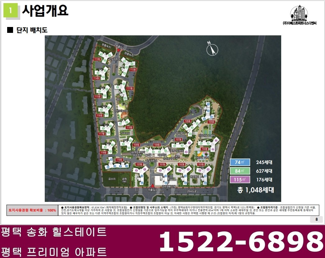 ■ 건축규모: 지하 1층 ~ 지상 15층 / 20개동 총 1, 048세대 / 74㎡ 245가구, 84㎡ 627가구, 115㎡ 176가구로 구성