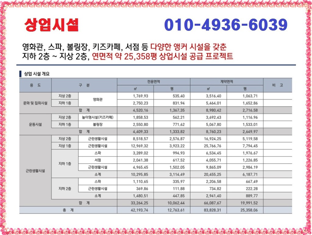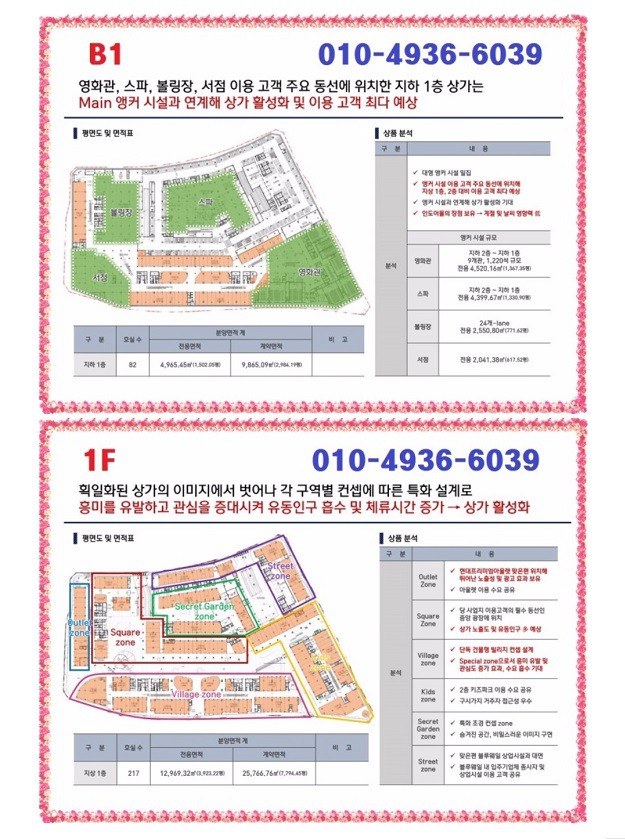 영화관, 스파, 볼링장, 키즈카페, 서점 등 이용 고객의 주요 동선에 위치하여 Main 앵커 시설과 연계하여 상가 활성화 및 이용고객 최다를 예상합니다.
