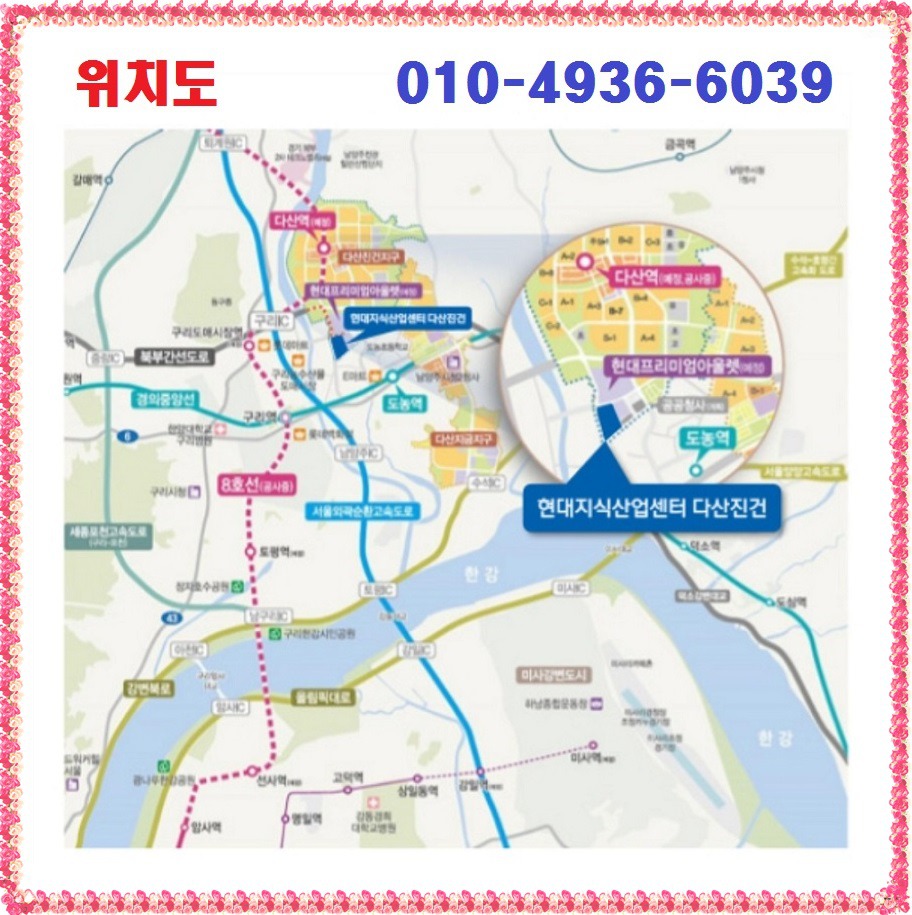 다산 현대프리미어캠퍼스는 8호선 연장사업인 다산역(가칭)이 2022년 개통 예정(잠실역 20분대 예정)이며 경의중앙선 도농역 이용이 가능(서울시청역까지 40분대)하고 인근 구리IC를 통해 북부간선도로, 서울외곽순환도로, 43번 국도 등 광역 접근성이 우수하여 편리한 교통망을 통해 물류비 절감 효과를 기대할 수 있습니다.