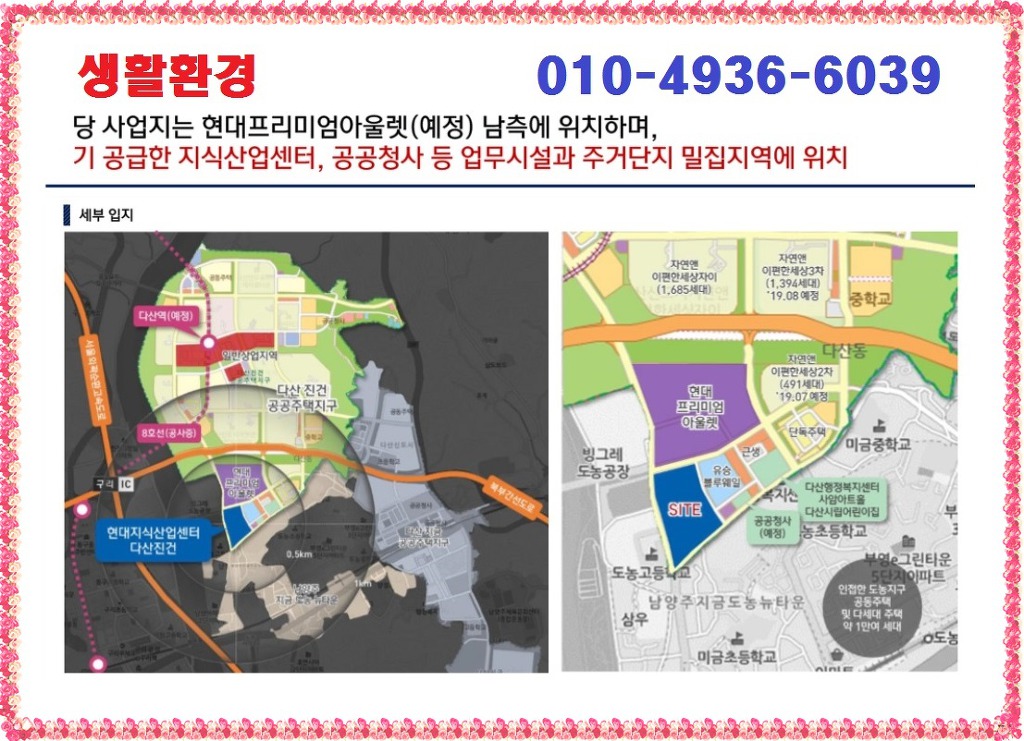 다산 현대프리미어캠퍼스 당 사업지는 2021년 개점 예정인 현대프리미엄아울렛(예정)이 남측에 위치하며 기 공급한 지식산업센터, 공공천사, 업무시설, 주거단지가 밀집하여 생활환경이 우수하고 학교, 교회 등과 왕숙천, 체육공원이 인근에 있어 쾌적하고 청정한 자연환경 속에서 힐링라이프가 가능합니다.