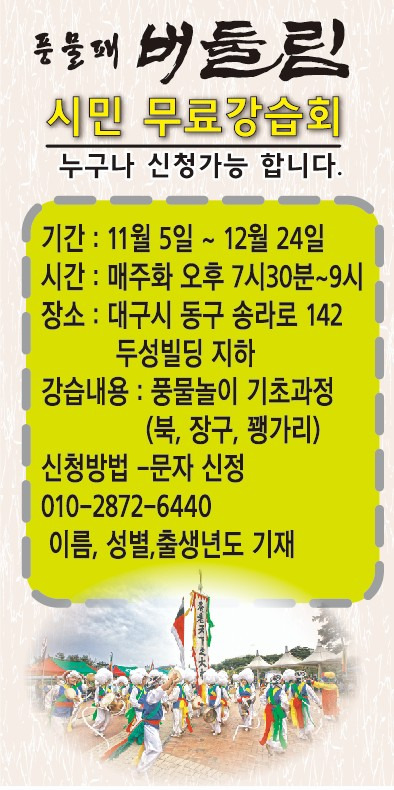 2024년 시민무료강습회(풍물) 작성자그사람|작성시간24.10.18|조회수30 목록 댓글 0 글자크기 작게가 글자크기 크게가 다음검색 현재 게시글 추가 기능 열기 북마크 신고 센터로 신고 댓글 댓글 0 댓글쓰기 답글쓰기 댓글 리스트