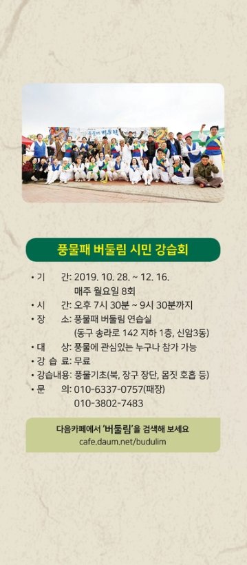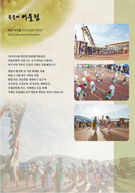 풍물패 버둘림 제29회 정기공연 작성자국흠|작성시간19.10.04|조회수152 목록 댓글 0 글자크기 작게가 글자크기 크게가 2019 풍물패 버둘림 제29회 정기공연 / 풍물 장구 북 기초가락 시민강습회 다음검색 현재 게시글 추가 기능 열기 북마크 공유하기 신고 센터로 신고 댓글 댓글 0 댓글쓰기 답글쓰기 댓글 리스트