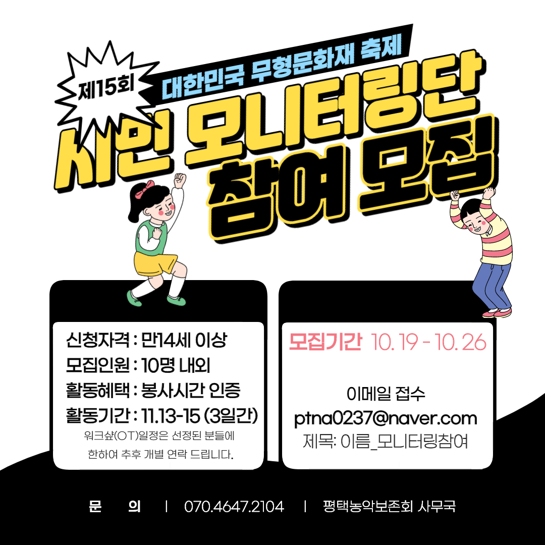 제15회 대한민국무형문화재 축제_시민모니터링단 모집 작성자평택농악보존회|작성시간20.10.19|조회수21 목록 댓글 0 글자크기 작게가 글자크기 크게가 다음검색 현재 게시글 추가 기능 열기 북마크 공유하기 신고 센터로 신고 댓글 댓글 0 댓글쓰기 답글쓰기 댓글 리스트